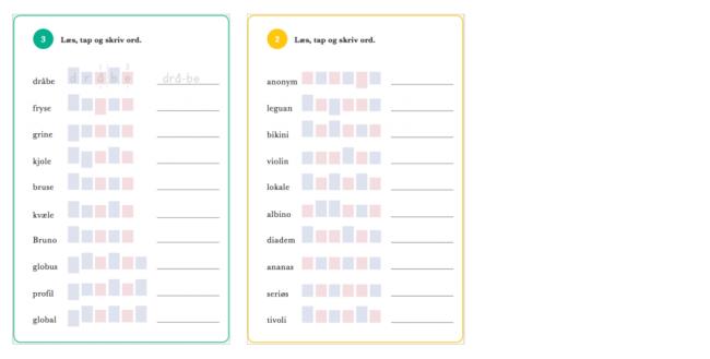 Nedenfor ses eksempler på øvelser fra Ord-materialet, der bygger på en rolig og stabil ordprogression i arbejdet med skriftens balase lydprincip.