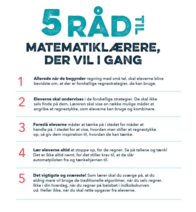 Samtidig er der behov for et kulturopgør på lærerværelset. Mange lærere har set lyset i regnestrategierne. Men de støder ind i andre lærere som holder fast i, at algoritmerne er de vigtigste.