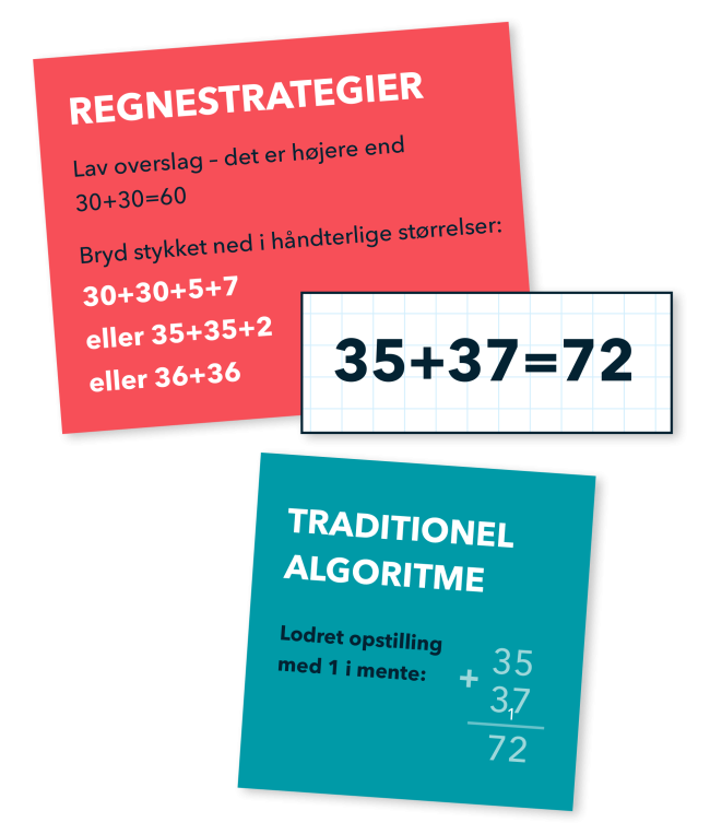 Og den følelse vil hun gerne have banket ind i børnene i stedet for algoritmerne. Allerede fra de mindste klasser skal børnene lære at arbejde strategisk. Først med små tal, hvor de begynder med at lære tællestrategier. Senere udbygget med tænkestrategier, hvor de laver tallinjer, fylder op eller splitter regnestykket op i dele, de nemmere kan håndtere.