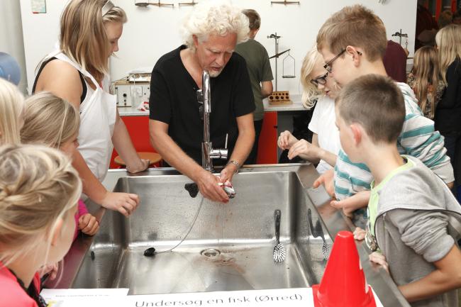 Det var også vigtigt at give et løft til den eksperimenterende del af naturfagene, siger han. I samarbejde med en lokal smede-virksomhed fik skolen for eksempel specialfremstillet en aflang vask, som er placeret som et centralt element i et af de tre store naturfagslokaler. Vasken bliver blandt andet brugt til forsøg med bølger og dissektion.